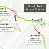 The Nordic trail system is accessible this weekend via three routes. Two require a hike up the front-facing alpine terrain of Hyak:
